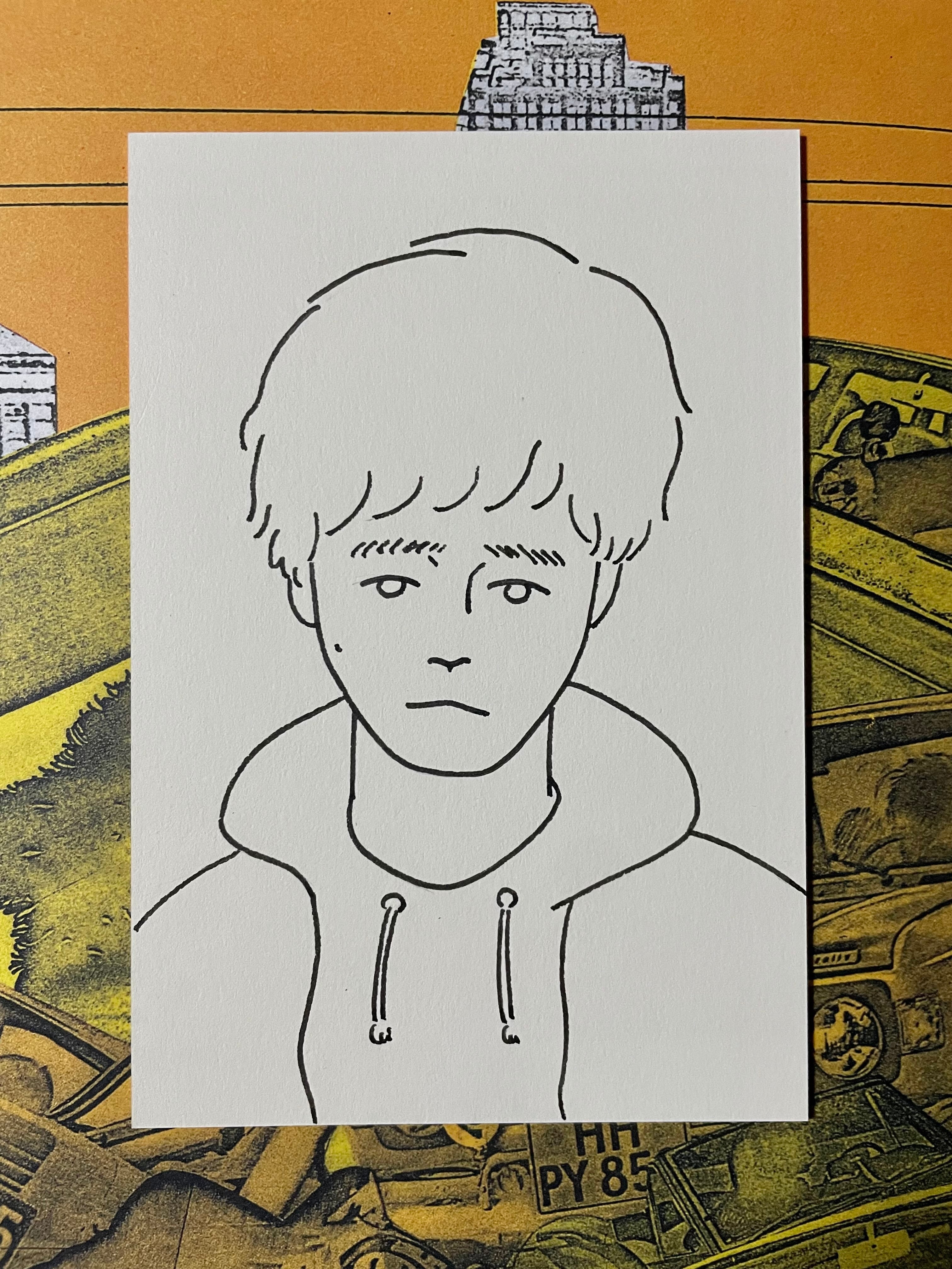 万年筆(黒)で似顔絵描きます。